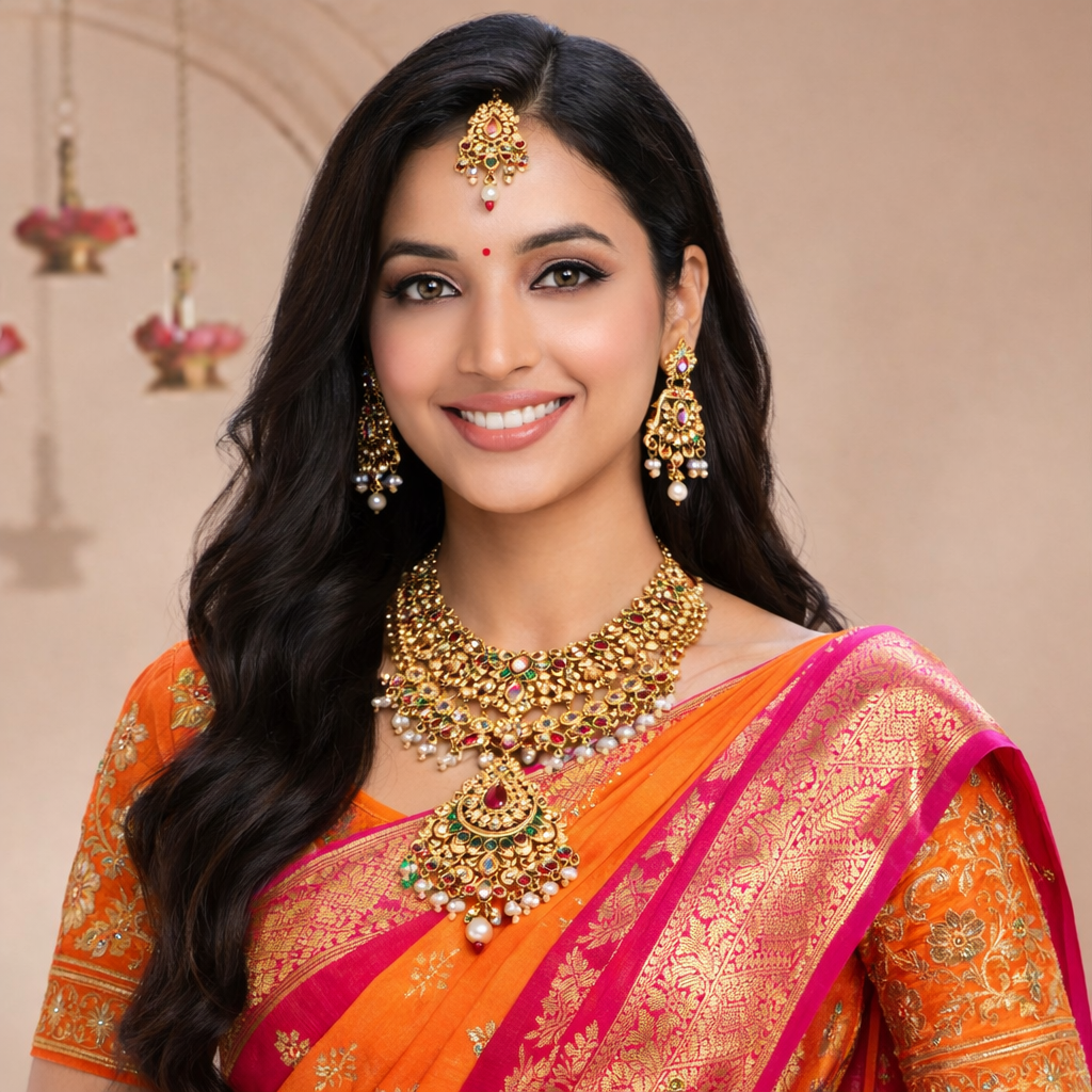 A CLASSIC KEMP SEMI BRIDAL JEWELLERY SET | MANGO MOTIF WITH MULTI COLOR STONE & GOLD BEADS