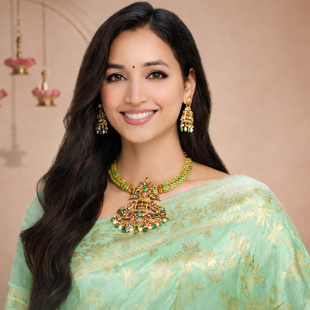 A CLASSIC MANGO MOTIF JADAU KUNDAN HARAM SET WITH LAYERED PENDANT IN GREEN BEADS