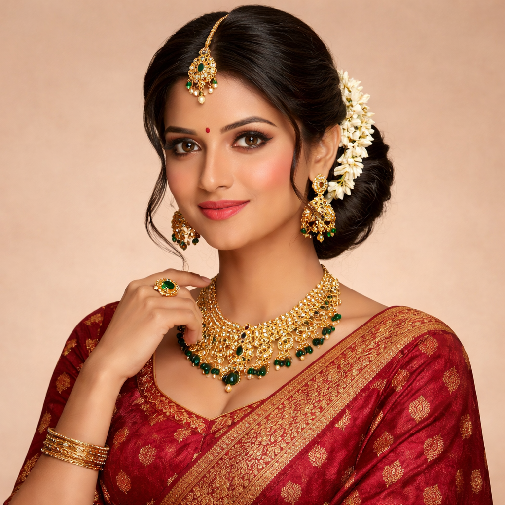 A CLASSIC KEMP SEMI BRIDAL JEWELLERY SET | MANGO MOTIF WITH RUBY STONE & GOLD BEADS